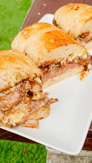 1.) Cut the tops off your garlic heads. Set in foil. Cover with olive oil and salt. Place into oven at 350° for about 30 minutes. 2.) Salt both sides of your steaks. Cover generously with the steak seasoning. Rub in and set aside. 3.) Add 1 tbsp olive oil to a pan over low medium heat and lay your steaks down. Cook until a nice sear begins to form on the bottom side. Flip over and repeat. When the internal temp reaches about 140°F add in half a stick of butter. Once melted baste your steals for another minute and then remove steaks and let rest, leaving the butter in the pan. 4.) Add your onions to the same pan. Cook until softened. Add in balsamic vinegar and continue cooking until caramelized. Takes about 25-30 minutes total. 5.) Make your garlic butter and aioli. Mash 2 heads of garlic and 4 tbsp butter in a bowl until paste. Mash the remaining head of garlic in a bowl with the Mayo and mustard. 6.) Spead the butter on the top and bottom of each loaf. Place in hot pan and toast. After toasting, spread aioli on bottom load, then top with steak, onions, cheese then place under broiler for a minute or two. Spread aioli on top loaf and place on top. 7.) Slice. Serve. Enjoy!View original recipe